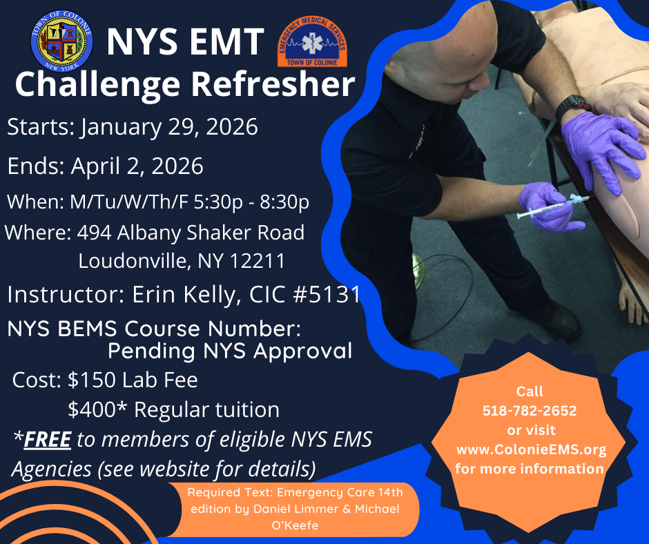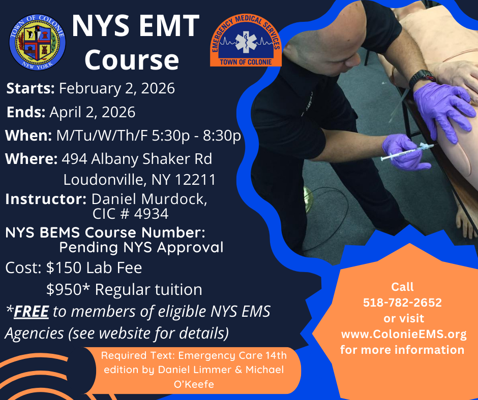 - Check/Money Order ($950 tuition, $150 lab fee) payable to Town of Colonie with student name and EMT Course in memo